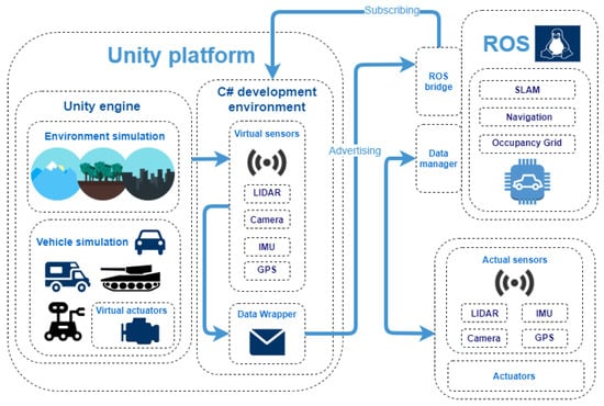 Unity is an Integrated Development Environment (IDE), which delivers a cross-platform graphics engine and can be used to create realistic 2D and 3D computer games, visualizations, and other interactive elements. To develop such an element, ready-to use components from the unity asset shop can be used to build the scenery. The platform enables the user to implement C# programs, which can modify the virtual scenes, objects, lighting, audio and other elements. Using the Nvidia PhysX physics engine, users can define the physical properties of objects (e.g., mass, velocity, acceleration) and define interactions between them (e.g., friction) and the environment (e.g., gravity). We use these components to create the realistic scenes of the simulation and create the virtual models of sensors (LiDAR, IMU, GPS and wheel encoder), which are then programmed by implementing the C# scripts. Data gathered using these sensors can be used by the various algorithms: responsible for mapping and localization (SLAM), path planning (Dijkstra’s algorithm [58]) and navigation (occupancy grid [59]). In the process of creating new algorithms, one of the most important stages is validation. To evaluate the efficiency and performance of the algorithm under observation, one can do it in a real-life environment, though this solution is very costly. As an alternative, it is necessary to perform this task in a virtual environment, which accurately simulates the real one. To achieve this, the test maps were created, mimicking a real-life space and labyrinths. We also built off-road environment maps, which allow us to validate the performance of the SLAM algorithms in external conditions. Additionally, the geometric and physical models of real-life vehicles were created to test the autonomy systems. To enhance the simulation functionality, a bridge between the simulation environment and ROS was created.
