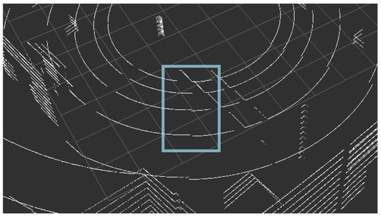 We also present the graphical results in the form of a point cloud obtained in a simulation, in which the rolling shutter effect is visible. We decided to use the outdoor environment instead of the indoor one, because the simulation of this effect is more necessary for outdoor applications, in which a vehicle can reach a significant speed. It can be seen in Figure 15. When we compare the obtained effect with the one observed in a real-life setup (Figure 3), we can clearly see that the simulation can accurately mimic this behavior.