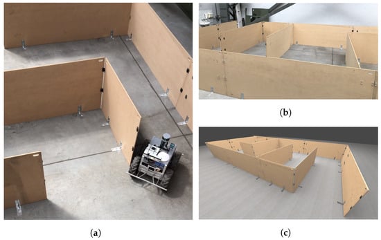 A real-world track (labyrinth) built for the purpose of the evaluation and the corresponding simulation. (a) A photo of an actual track; (b) A photo of an actual track; (c) A screenshot of a simulated track.