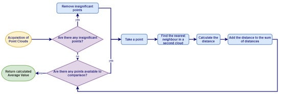 To compare two point clouds and evaluate the accuracy of the simulation, we propose an algorithm which is presented in Figure 5. Point clouds are compared at six characteristic checkpoints marked by a measuring tape and projected to simulation. First, we remove the insignificant points, e.g., in the examined case, all the points above the height of the labyrinth. Depending on the point cloud, this can accelerate the algorithm by several percent. Afterward, we iterate through the points, and for every point, we find the nearest point in the second one and sum up a distance between these two corresponding points. We repeat the same procedure using the second point cloud as the reference. For every cloud, we calculate the average distance between the points, and then the average of these values. The obtained value is the final score which describes the average distance between the point clouds.