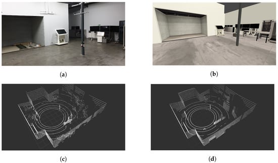 Sample LiDAR Point Cloud extracted from a real device in a real-world observation versus obtained from a simulation framework. (a) An actual photo of a laboratory room; (b) A screenshot of a simulated laboratory room in Unity; (c) Extracted point cloud from a real device—Velodyne VLP-16; (d) Extracted point cloud from a simulation.