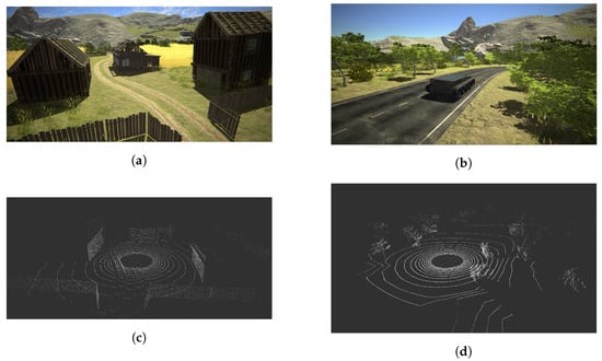 Sample LiDAR Point Cloud extracted from two simulated heterogeneous environments. (a) A screenshot of a simulated rural environment; (b) A screenshot of a simulated natural environment; (c) Extracted point cloud from a simulated environment (a); (d) Extracted point cloud from a simulated environment (b).