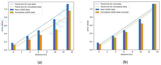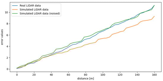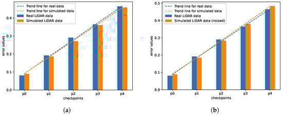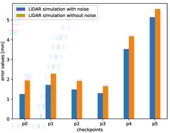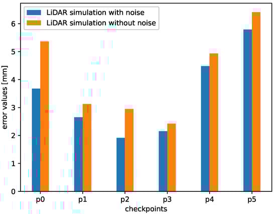 In Figure 9, we present the average error value between the subsequent points in the clouds obtained from an actual device and a simulation. We use the track presented in Figure 4. We can notice that the errors for both simulated data with and without noise are low, approximately 6 mm and 6.5 mm, respectively, which means that the similarity in terms of a distance between the points of the simulated and real point clouds is high. We can clearly see that adding noise to the simulated point cloud decreases the mean error values for all the checkpoints and additionally increases the similarity.