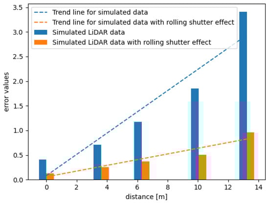 Moreover, the difference between the errors obtained using simulated data with and without the rolling shutter effect increases significantly with time. It can be observed in Figure 14. It is not possible to match the linear trend well to the bars representing data without the rolling shutter, as the error increase is close to the exponential one.