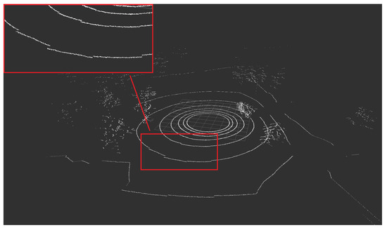 The term of the rolling shutter effect [60] is usually used in the field of photography to describe the characteristic distortion on the pictures of the quickly moving objects, for which the movement occurs perpendicularly to the camera axis. It is caused by the construction of the shutter mechanism in the cameras and the line-by-line retrieval of the images from the photosensitive matrix. A very similar effect can be observed in the LiDAR context [61,62], though the origin, in this case, is different. The data are gathered using a laser beam or multiple laser beams distributed vertically and a detector. This equipment set rotates (usually 20 rps at most) and delivers the data which is used to estimate the distance. Due to the relatively small spinning frequency of LiDARs, the time needed to acquire a single scan is relatively long (e.g., 10 Hz for Velodyne VLP-16 spin frequency translates into 100 ms duration of a full scan). If the translational motion speed is high in comparison (a significant movement of the vehicle is observed) to the rotational movement, the distortions in the gathered point cloud occurs, which is caused by the translations during the full rotation. The Velodyne LiDARs deliver the data in small packets, in which the distortion rate is low, but in the full view, on the borders of the subsequent fields, the effect is clearly visible. Due to these distortions, it is not possible to directly (rigidly) transform the packets of the frame, but a continuous transformation or its approximation is necessary (or some other technique to minimize this effect should be applied by a SLAM algorithm) [61]. Laser scan measurements are often subject to the rolling shutter effect in the case of the significant movement of the vehicle and not taking this effect into consideration by a SLAM algorithm can result in serious map quality degradation and pose estimation errors [62]. Figure 3 presents a slight rolling shutter effect. It is hard to observe a very visible effect in a relatively small environment because the space is limited and a high speed cannot be achieved, but even in such an environment, this effect can be encountered and should be taken into consideration. In the simulation of the outside environment, where space is not limited and high speed can be easily achieved, the impact should not be omitted if the target is to obtain an accurate reflection of the real-life behavior.