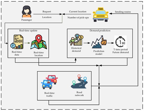 Some of the research works focus on taxi drivers sharing ride information and details. In [33], the framework of data-driven system is simulated based on the simplifying grid map. This process shows the optimization of the cost function for the provided path to driver, e.g., the distance of travel or gasoline consumption. In [34,35], re-balancing the data-driven system proposed for the vehicles across the region, which contains the lack of prediction in the future demand. There are various solutions, such as providing the graph partitioning based on the bipartite graph with minimum complexity. This process can execute into ride-matching a one-to-one issue. In some of the studies in this area, the matching and strategy of competition issue is considered for the ride-hailing system [36]. The observed solutions for the mentioned problem are building the simple grid map without reflecting on predicting the demand, dispatching the taxi, or selecting the route.