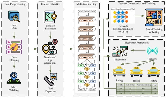 This research presented the problem of prediction for taxi pick-up and drop-off demand services. We applied the machine learning and multi-task learning approaches to improve this system’s performance and prediction results. Providing transparency and security between the passenger and taxi driver, track- and trace-based on IoT devices and blockchain platform. Information extraction from IoT devices and saving them in blockchain systems gave security and reduced passenger and driver fake actions. The proposed system was tested in Jeju Island, South Korea in taxi demand service, and the result presented a RMSE of 2.22, which shows this system has a lower RMSE in comparison with other baselines. The main contribution of this work is innovating the framework in learning-based for taxi demand. The first step is to extract the spatiotemporal features and apply the LSTM feature embedding to obtain the pick-up and drop-off correlation. The external factors were also considered and finally built the prediction result. This procedure concludes that the standpoint of spatial correlation for taxi demand and set regions will affect the other. From the temporal correlation point of view, the taxi demand is closely similar in a time interval. The spatiotemporal correlation should be together and not separated because the pick-up and drop-off directly affect each other. In another case, the transport conditions, e.g., weather, holiday, etc., also affect the demand for taxis. In future work, we will consider improving the accuracy of prediction based on the time-series algorithms’ performance. Similarly, using the convolutional graph network for predicting taxi demand service and reflect on this model based on the multi-step prediction.