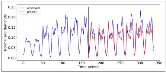 The first step is the prediction of interesting passenger areas. In this process, the LSTM model is applied in the proposed system. In this case, the demand is based on one week, 24 h per day, which is 168 h for predicting the next hour. To do this, the historical data of the previous week applied for predicting the demand for the next hour, which is taken automatically based on weekdays and weekends. This process trends the consecutive features which means the model automatically knows if it is a weekend or weekday. To avoid adding extra information as input, the next hour prediction demands relying on the previous week’s inputs. This means the 168 h of the previous input predicts the demand of next time considering the holidays, weekdays, and weekends as consecutive features. The prediction period of demand is not optional. The matching of the taxi to the region is provided every hour to predict the hourly demand. To predict the traffic demand over time, the main goal is to evaluate each region’s demand and the instant of each period. The demand information and traffic information shared with the help of VSN between the fleet at once, e.g., the remaining passenger’s prediction is evaluated based on considering the picked passengers. Figure 4 shows the performance of the LSTM model based on the hourly prediction in the proposed system. The model trained used the historical data and predicted the future taxi demand. The LSTM model encompasses two hidden layers and one output. The input is the 168 h that is the previous week’s hourly data.