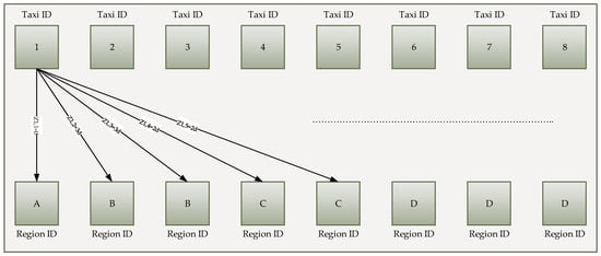 The Taxi ID is D, and the Region ID is E. As shown in Figure 5 the and belong to the same region B. The optimization of the matching procedure evaluated based on the ILP problem as below: