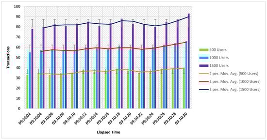 Figure 9 shows the transaction results of the Hyperledger Fabric platform per second. We considered three main groups of users for evaluating the performance of the proposed system. Each group contains 500, 1000, and 1500 users. The statistical measurements are used to evaluate the taxi demand service performance in the blockchain framework.