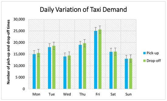 Figure 12 presents the daily variation of pick-up and drop-off taxi demand in one week from Monday to Sunday. The blue color represents the pick-up records, and the green color represents the drop-off records. As shown in Figure, the highest is on Friday with the maximum pick-up records of 25,000 passengers and almost 26,000 drop-offs. The lowest is on Sunday with a maximum 14,000 of pick-up and drop-off records.