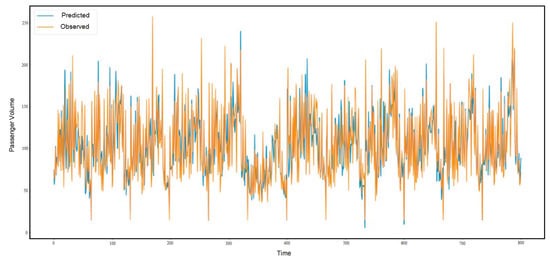 Figure 13, Figure 14 and Figure 15 present the prediction result of the taxi demand in three time periods. The first one is within fifteen minutes, the second one is within thirty minutes, and the last one is within sixty minutes. The prediction process is based on time and passenger volume. The predicted records are shown in blue, and the observed records are shown in orange.