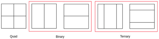 For VVC, a similar but extended CTU concept was inherited from its predecessor, HEVC. In the new standard, the quadtree scheme had been replaced earlier by a quadtree plus binary tree [25]. Therefore, a vertical or horizontal directional partition of a binary tree was added to extend the quadtree plus binary tree. Finally, QTMT partitioning was adapted to the VVC standard. In the QTMT scheme, the blocks were divided into smaller square sub-blocks for the QT structure and into smaller rectangular binary and ternary sub-blocks for the multi type tree structure. Moreover, a block can be divided into the horizontal or vertical direction using binary and ternary splitting. Further, in the ternary split, a block was divided into three sub-blocks with a central sub-block 2 times larger than the outer blocks. The VVC supported partition schemes are displayed in Figure 2. In addition, VVC allowed a maximum CTU size of 128x128 pixels [26]. These features helped VVC achieve a more flexible and efficient partitioning structure compared to the HEVC standard.