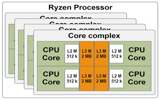 In this study, two platforms were used: an AMD Ryzen Threadripper high performance processor [34] and an embedded NXSoC [22]. The architecture of the Ryzen processor is shown in Figure 3. This processor is based on Zen microarchitecture [35], which has a primary building block a core complex (CCX). Ryzen has 4 processing complexes, and each CCX includes 4 cores. Each core provides 2 threads with a base clock speed of 3.4 GHz, and all 32 threads have simultaneous multi-processing power. Each core is called a HGPP in this paper. In addition, all 4 cores share 8 MB of L3 cache memory, and each has its own 512 KB of L2 cache memory. All the L3 cache memories of different CCXs are allowed to be addressed and accessed by all CCX modules [36]. The maximum memory speed was 3.67 GHz.