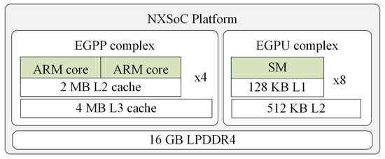 The architecture of NXSoC is presented in Figure 4. In summary, it is composed of an EGPP complex and an Embedded GPU (EGPU) [37] complex, where the EGPP complex has 4 clusters and each cluster has 2 ARM cores with a maximum clock frequency of 2.26 GHz. Each of these cores is called an EGPP in this study. In a cluster, 2 EGPP cores share 2 MB L2 cache memory. Furthermore, all the clusters have access to 4 MB L3 cache memory.