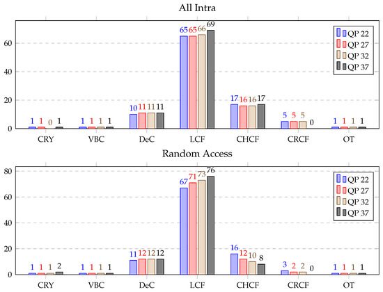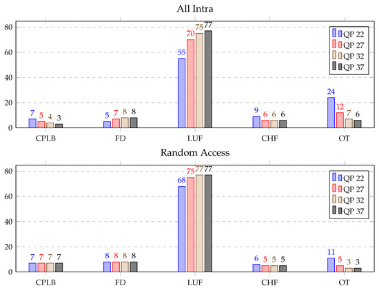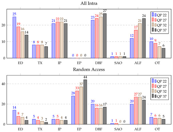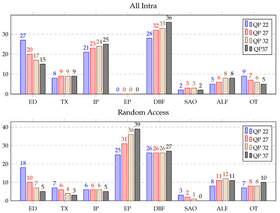 In addition, Figure 6 shows the computational cost (in %) for each functional block, QP and configuration, averaged for all the test sequences. The most time-consuming modules for AI configurations were the in-loop filters, the intra prediction and the entropy decoding blocks, which accounted for approximately average 44%, 22%, and 19% of the decoding time, respectively. Further, TX, IP, and SAO consumed similar time for different QPs. In addition, the computation load of ED and OT decreased and the computation load of DBF and ALF increased for the increment of the four QPs from 22 to 37. On the other hand, inter prediction and in-loop filtering blocks were the most time-consuming blocks for the RA configuration, and they accounted for approximately 78% of the decoding time. Moreover, the computational cost of all the decoder blocks were decreased for the changes of four QPs from 22 to 37 except the computational cost of EP and ALF.