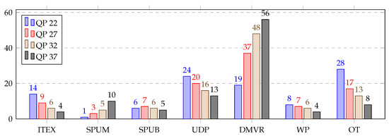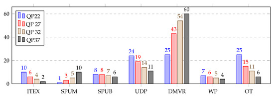 A detailed view of the inter prediction over the HGPP is shown in Figure 7, which shows the average time distribution for different parts of the inter prediction (in %) over the HGPP with QP 22, 27, 32 and 37. It was found that with the change in QP from 22 to 37, the average computational load of the DMVR increased from 19% to 56%, and the average computational load of the UDP decreased from 24% to 13%. The average computational load for the other inter prediction parts varied by 1% to 11% for different QP values.