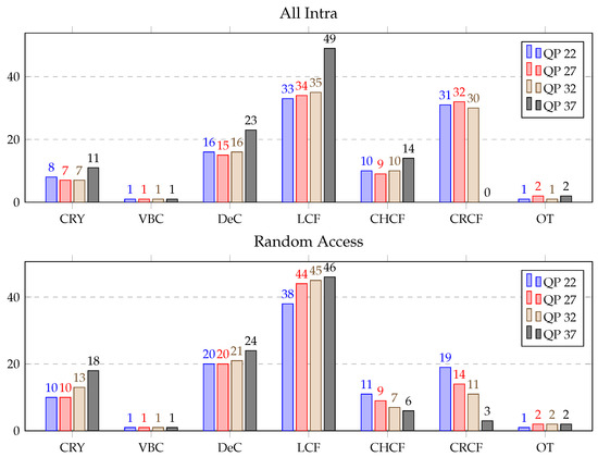 Detailed ALF profiling for QPs 22 to 37 with all the configurations over HGPP is displayed in Figure 11. The average computational load of the CRY, DeC, LCF, CHCF, and CRCF varied maximum 2% for the AI sequences with QPs 22, 27 and 32. But for QP 37, CRY, DeC, LCF, and CHCF increased 3% to 14% with respect to other QPs and CRCF decreased to 0%. Moreover, all the ALF functions for the RA sequences showed a pattern similar to that of the ALF function for the AI sequences. However, the time consumed by the CHCF and CRCF decreased by 5% and 16%, respectively with QP 37 compared to QP 22.