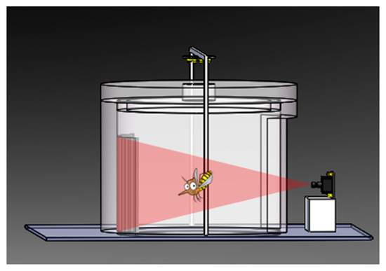 We will here first describe current mosquito sampling methods and then present the system used in our imaging study. The main conventional methods for monitoring adult mosquitoes are the human-landing catch, human-baited double net trap, and light traps techniques. The human-landing catch approach uses a tube for mosquitoes trying to penetrate the human skin [45]. This method puts collectors at risk of being bitten by infectious mosquitoes and contracting malaria, which is of course very problematic. The human-baited double net trap is divided into an inner net and an outer net [46]. The attractant sits in the enclosed area of an inner net, exposing free skin areas; the collector then uses an electric mosquito sucker between the inner net and the outer net to collect mosquitoes, which settled on the mosquito net. Since the distance between the attractor and the mosquitoes is larger, the mosquito trapping effect may be reduced accordingly. The light trap method utilizes the phototaxis of mosquitoes. The mosquito light trap is often placed near mosquito breeding grounds [47]. It has limitations such as easy damage to the equipment, and attraction of also other types of insects subject to phototaxis.