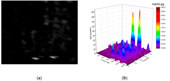 - Step five: After Step three and Step four, we can get a new matrix of dimension (1480 − 200 + 1) × (1104 − 144 + 1), composed of the calculated correlation coefficient rccoeff values. They are limited between −1 and 1. The higher the correlation value is, the greater the matching degree is. The result is shown in Figure 4b), where the vertical scale, showing the correlation, has been multiplied by 255 for clarity. Then we select the maximum value, the minimum value and maximum position information from the matrix.