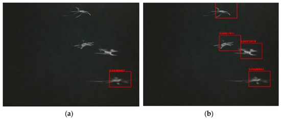 Single template matching is the main idea of our proposed method. On the basis of signal template matching, a multi-target template matching algorithm was developed by adding a covering procedure. In order to further improve the detection efficiency, a padding operation was introduced to multi-target template matching, which constitutes the detection algorithm we proposed. Fuzzy preprocessing operation was not considered in the steps. In fact, Fuzzy preprocessing can reduce imaging interference caused by various kinds of uncertainties. It has been shown that it is possible to further improve the recognition accuracy by performing a Fuzzy preprocessing operation on the image [60,61]. To evaluate the performance of these three types of detection algorithms and the degree of possible improvement, we recorded 122 insect images (71 images of mosquitoes and 51 images of bees) and examples of results from the three different algorithms are shown in Figure 5 and Figure 6. Figure 5 shows the different results between single template matching and multi-target template matching. After adding the covering procedure, more than one target can be detected. The target (mosquito) near the boundary cannot be found by our algorithm in Figure 6a. By padding the boundary, there are more pixels near the target that can be used when calculating (see Figure 6b). Table 1 shows the different detection rates for these three algorithms, which includes Single template matching, Multi-target template matching and our proposed detection algorithm. After our improvements, the detection rate reaches 92%, from an initial 64%.