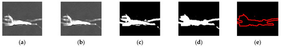 Processed sample of bee. (a) Original ROI; (b) Normalization; (c) Binarization; (d) Morphological processing; (e) Classification results.