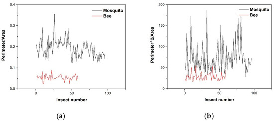 To evaluate the performance of the classification methods, several pictures of bees were also recorded by the camera. After Step five in Section 2.1, a set of processes were performed with the ROI to classify mosquitoes and bees. The processes are displayed in Figure 7 and Figure 8. We can see, from Figure 7d and Figure 8d, that the body area of a bee is much larger than that of a mosquito. At the end of the processing step, only those targets classified as mosquitoes by the algorithm will be colored, otherwise there will be no operation. Different results are shown as Figure 7e and Figure 8e. For crude classification we calculate the area and perimeter of the target in the ROI. Perimeter means the number of pixels contained in the edge of the contour, while area means the number of all the pixels contained in the contour. Using these parameters, we calculate two contrast functions, perimeter/area and (perimeter)2/area. The two function values for each mosquito and each bee are plotted in Figure 9a,b. We note that while the second function (plotted in (b)) is dimensionless [62], i.e., only depends on shape/structure, the first function (plotted in (a)) also depends on size. We note, that shape/structure (the main information from imaging) alone can discriminate between the insects, but when also incorporating size (a), the discrimination becomes better.