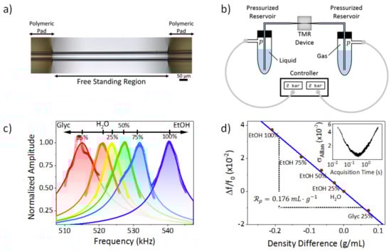 The calibration of our TMR device is made by measuring its resonance frequency filled with different aqueous solutions of ethanol (EtOH) and glycerol (Glyc) with different volumetric concentrations of well-known densities [10,11] (Figure 1c). The resonance frequency variation as a function of fluid density presents a linear dependency (Figure 1d), with responsivity of 0.176 mL·g−1, which is in good agreement with the value predicted by Equation (2), (0.184 mL·g−1). Combining this responsivity with the minimum value of the Allan variance, 1.3 × 10−7 (Figure 1d, inset) we obtain a density resolution of 0.7 µg/mL when working with aqueous solutions, one order of magnitude better than the current state-of-the-art [24]. Given the resolution shown by the devices and the pressure range our pump can apply, we are able to measure the density variations caused by compressibility effects either in liquids (10 µg·mL−1·bar−1) or gases (100 µg·mL−1·bar−1).