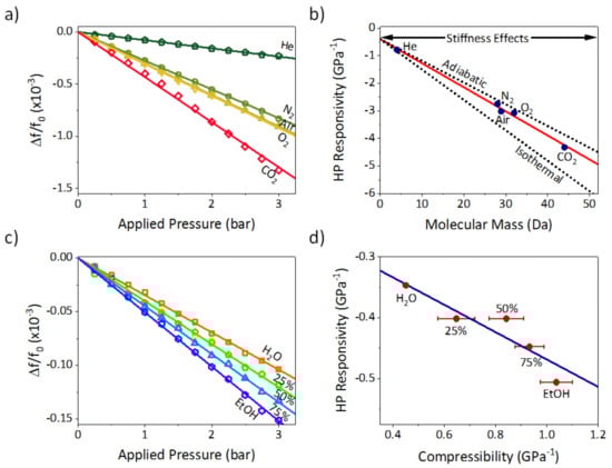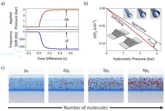 On the other hand, when a fluid is hydrostatically compressed, the number of molecules inside a certain volume increases (Figure 2c), which is translated into a density variation () through the compressibility factor, , as, [12]. This density variation is translated into an additional mass, consequently shifting the resonance to lower frequencies: