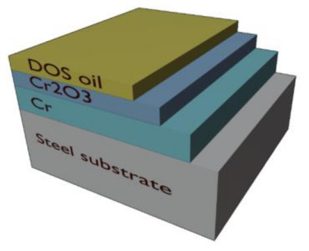 On-line ECCS layer structure for packaging steel. ECCS comprises a steel substrate, a metallic chromium layer, a chromium oxide layer and a Dioctyl Sebacate (DOS) oil layer. ECCS was developed in the 1980s for the packaging market, providing cost savings in comparison to tinplated packaging products as ECCS requires a much thinner coating to provide similar corrosion protection [20]. The steel substrate for this application is typically less than 0.5 mm in thickness and varies with customer specifications. The total chromium layer for this application (summation of both the metallic and oxide layers) has a maximum thickness of 50 nm and again varies with customer specifications, but the thickness of these coatings must also comply to European standards, EN 10202:2001, to ensure product quality requirements [21].