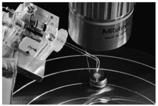 Photograph of an electrochemical cell used in coulometry. The tip of the cell has direct action with the coating structure, with a crater formed on dissolution on the sample. (Reprinted from [37], Copyright © 2011 John Wiley & Sons, Ltd.).