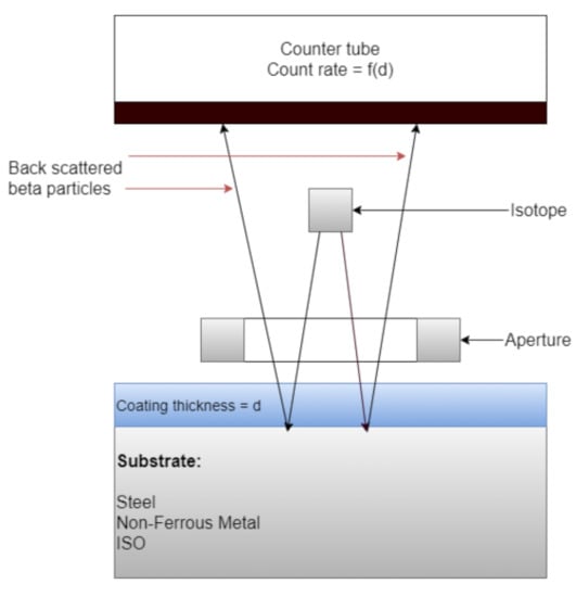 For the Beta particle backscattering method, the sample under test is exposed to beta particles from a beta emitting isotope. Particles are directed though an aperture onto the sample with the coating to be measured. A percentage of these particles are backscattered back through an aperture into a Geiger–Muller tube [10]. Upon interaction of the backscattered particles with the gas within this tube, an ionization event occurs which is detected by the tube electrodes, held at a high potential difference, forming an electrical pulse which is then electronically counted. Materials of low atomic number backscatter at a lower rate than materials with a high atomic number. The change in the rate of electrons backscattered is a measure of the coating thickness. However, for this method to work effectively, the atomic number difference between the coating and the substrate must differ by at least 5 atomic units. Chromium’s elemental atomic number is 24, whereas steel, predominantly iron, has an atomic number of 26, so the atomic number difference between these elements is only 2, rendering this method not feasible for this measurement application. Figure 3 illustrates the operating principle of the beta-backscatter method.