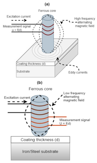 This method consists of a measurement probe containing a low frequency AC coil which is placed on the sample surface. By bringing a ferromagnetic substrate into the magnetic field, the core magnetic flux density is changed and is captured by a secondary sensing coil. The difference between the contact point at the sample and the distance to the substrate would equal the coating thickness. The typical time for a measurement ranges between 50 and 100 ms [10], which has potential for in-line measurement; however, this method generally requires contact with the sample, and has only micron level thickness determination. The magnetic induction method is used for measuring thickness of nonferrous coatings on ferro-magnetic substrates, thickness of magnetic coatings on non-magnetic substrates and thickness of magnetic coatings on magnetic substrates if the permeabilities of the coating and substrate are different and constant. Both Petrilli [10] and Hinken et al. [41] express the application of the eddy current and magnetic induction methods unfeasible for this application (ferromagnetic stainless-steel substrate) due to the limitations of the substrate/coating material combinations along with the thickness limitations, rendering this method not feasible. Figure 4b illustrates the operating principle of the magnetic induction method for coating thickness evaluation.