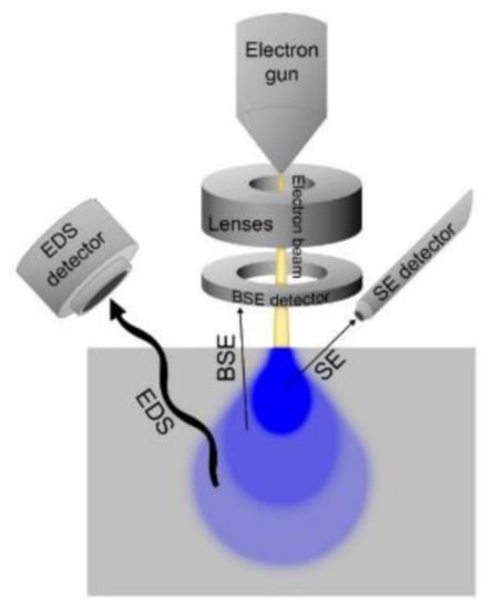 Operating scheme of SEM with SE, BSE, and EDS detection. (Reprinted from [26], CC BY 4.0 license).