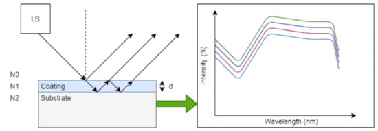 Optical reflectometry is a method which analyzes the reflectance spectra of a sample to measure characteristics such as optical constants and thin film thickness and is a well-known and powerful technique for measuring film thickness quickly in several industries [12,74,75,76,77]. There are extensive variants of this method, which are widely available for review in the literature, but the key operating principle of this methodology is the illumination of a sample with an optical light source, detection of the reflected intensity and fitting this intensity as a function of coating thickness [76]. Most technologies utilizing this method measure a range of wavelengths to calculate the film thickness, and one of the key limitations to this measurement method in the past is that the technique is only able to measure one point at a time [76]. Variants of this method have included volumetric detection using Charge Coupled Devices (CCD) to monitor an area of a sample, simultaneously, with the disadvantage of decreased detection speeds, but there is literature available into techniques which can reduce these detection times, such as direct phase extraction techniques [78]. Reflectometry methods usually operate at normal incident angles for measurement; however, varying incident angles can be used which again increases the system complexity in terms of monitoring both parallel and perpendicular polarizations, based on the Fresnel equations [79]. This method also consists of a form of self-interferometry, in where there are several internal reflections between the coating and substrate interfaces. These coating and substrate interfaces are often modelled using the Fresnel reflection coefficients to determine the reflected intensity present at the optical detector, however, for several layers these calculations become complex, and researchers tend to model these interfaces using Transfer Matrix Methodologies (TMM) [80]. The main operating principle for this method relies on reflection intensity, which is calculated by the ratio of the reflected intensity at the detector to the incident intensity. In terms of measurement limitations for this application, to measure metallic coatings, there is a requirement that the incident radiation can transmit through the coating to the substrate, and for chromium coatings, the calculated limitation through Beer’s law is roughly below 70 nm coating thickness. As this application intends to monitor thicknesses of less than 50 nm, this method has high feasibility [29]. This method has high speed capability, has the potential to measure the thickness ranges of the application area, is a non-contact and non-destructive approach which renders this method high feasibility for future research. There are several factors that must be considered taking this method forward, such as the surface roughness of the coating and the substrate, the coating uniformity and the production process parameters that could hinder measurement, most importantly, the vibration of the electroplated product running continuously through the production line. Figure 6 illustrates the operating principle of optical reflectometry for coating thickness evaluation.
