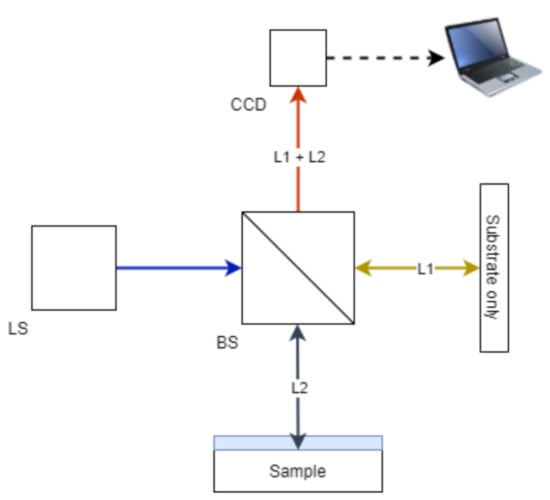 Interferometry is a very similar optical technique to the reflectometry method in that they both use the phenomena of optical reflection or transmission to gain an understanding of a sample under measurement. Where reflectometry measures the intensity of a reflected or transmitted spectrum and takes into consideration the self-interference of the layers of a sample, the interferometry method takes into consideration the optical path difference in relation to a single light source between a sample under test and a reference mirror via a beam splitter [81]. As the optical path difference will change relative to the reference mirror and the sample as a function of coating thickness, differing phases based on the optical path difference will provide constructive or destructive interference for the output signal. There are many variants of optical interferometry, such as using differing light sources such as white light or singular wavelength [16,82], differing optical path layouts [83,84], and differing detection elements [85,86]. There are many interferometric solutions for the measurement of thin film thickness which operate on the principle of interference but utilize different components within the system for different applications. An interferometric and reflectometric method which may be suitable for this project’s application was reported to be non-destructive, non-contact and has high-speed data acquisition, has published results within the nanometer thickness range in a microelectronics production setting [81]. Typically, interferometry is limited by a factor of the incident wavelength of light, however, the proposed system [81] utilizes Fast Fourier Transforms for the surface topography coupled with a reflectometric approach which has highly promising continuous in-line implementation. The setup proposed is basically a Michelson interferometer with two arms, one to generate the reference wave from a flat mirror and one to generate the reflection from the sample of interest. Two similar objective lenses are added into the system to adjust the lateral measuring magnification. The thickness ranges for this method have been reported down to a single nanometer [87], but like reflectometry, this setup is limited to metallic layers within the optical transparency region, which renders interferometry highly promising for this application. Figure 7 illustrates the operating principle of optical interferometry for coating thickness evaluation.