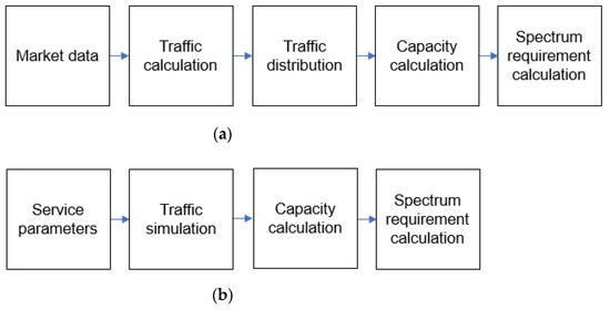 Generally, the technical process of estimating spectrum requirements for mobile communications is based on four essential issues: definition of services, market expectations, technical and operational framework, and spectrum calculation algorithm. The conventional methodology in ITU-R M.1768-1 [15] consists of several steps starting with market data analysis. It uses the parameters obtained from market data analysis in the Poisson traffic model. Then, it distributes traffic to several radio environments to determine required system capacity to carry the offered traffic. Capacity calculation algorithms are given separately for circuit-switched and packet-switched service categories. Finally, it calculates the spectrum requirements and applies necessary adjustments to consider practical network deployments. The overall flow is shown in Figure 1a.