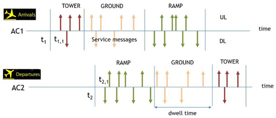 AeroMACS services begin as the aircraft enters the airport, and the service follows predetermined procedures based on the aircraft’s location as shown in Figure 2. The arriving aircraft AC1 moves in the order of tower, ground, ramp, while departing aircraft AC2 moves in the order of ramp, ground, tower. The kth message generation time of AC1 is denoted by . The subscript k indicates one of the AeroMACS messages given in Table 1. Up arrow indicates uplink (UL) message and down arrow indicates downlink (DL) message. As it is generally accepted that the message generation time t is a random process determined by the operational domain and flight phase, we develop a stochastic data traffic simulator based on the parameters reported in [4,24,25,26]. The following assumptions are used in this paper.