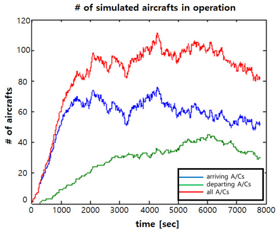 As shown in Table 2, the offered load is different according to operational domain, flight phase of an aircraft, service category, and direction of data transmission (UL/DL). According to [24], traffic is stochastically generated based on the rate of aircraft arrival and departure. There is no restriction on the packet length, and therefore, the fluctuation of the traffic load over time is very large. The arrival scenario assuming an average of 50 aircraft is the result of calculating the offered load assuming that the average number of arriving aircraft is 33.27/h and the average number of departing aircraft is 16.73/h. In the departure scenario, we assumed that the average number of arriving aircraft is 14.23/h and the average number of departing aircraft is 35.77/h. In this paper, system capacity is estimated based on the average traffic load during the peak hour.