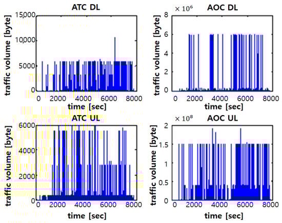 The traffic pattern and demand for each AeroMACS service scenario were studied in SESAR [24,25,26]. Traffic for each service was generated by simulations in consideration of the area within the airport, the occurrence frequency, the residence time of each area of the aircraft, the number of aircraft arrivals and departures per hour, and the average number of aircraft within an airport. A total of 32 service scenarios were considered. Each scenario was based on the average number of aircraft handled per hour at the airport, the spatial classification (i.e., tower, ground, or ramp), and the temporal classification (i.e., ARRIVAL or DEPARTURE). ARRIVAL is a scenario where the arrival rate of an aircraft is twice the departure rate, and DEPARTURE is the opposite scenario. The service scenarios and offered traffic loads used in this paper are described in Section 4.