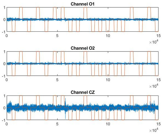 The sensors connected to this cap can monitor EEG signals at 500 Hz frequency. The Enobio cap works on eight different channels. In order to decrease the artifacts due to muscular activity, the EEG system is equipped with two additional electrodes to apply a differential filtering to the EEG signals. These two electrodes are positioned in a hairless area in the head (usually behind the ears by the neck). In the proposed experiments, we focus on three channels labeled O1, O2, and CZ, according to International Standard System 10/20. The first two are positioned in the occipital lobe; the other in the parietal one (Figure 3). The reason for this choice is that the signals coming from the occipital lobe are commonly associated with visual processing [32], while the signals coming from the parietal lobe are related to body movement activities. In addition, a good correlation between occipital centroparietal areas improves visual motor performance identification [33].