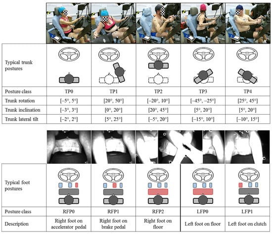 The reconstructed driver postures (Figure 2) were classified them into nine classes in our previous work [16] by concurrently considering trunk and foot positions. In the present work, we define postural classes by body part, making it possible to select more relevant pressure features for recognizing the posture of the trunk, as well as the left and right feet. The posture class definition scheme is illustrated in Figure 3. The trunk posture was characterized by three trunk angles (rotation, inclination, and lateral tilt) with respect to the standard trunk position (TP0) at the beginning of each task. By analyzing the trunk angles, four additional trunk posture classes (TP1 to TP4) were defined with noticeable deviations from TP0 in terms of rotation, inclination, or lateral tilt. For the right foot, three classes (RFP0—right foot on accelerator pedal, RFP1—right foot on brake pedal, and RFP2—right foot on floor) were defined, while two classes (LFP0—left foot on floor and LFP1—left foot on clutch) were defined for the left foot.