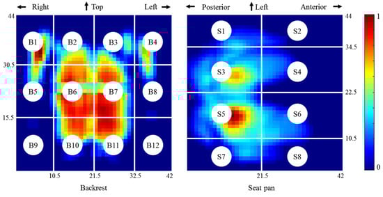 Pressure mat segmentation. The pressure distributions on the backrest (left) and seat pan (right) were normalized by the respective peak pressure.