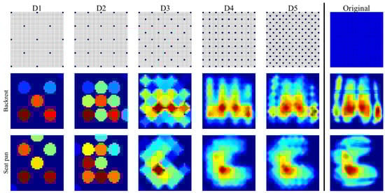 To test if the number of pressure sensors could be reduced to overcome the price barrier, posture classification was performed on the basis of five newly designed pressure mats (D1–D5, Figure 5) by lowering the number of sensing elements compared to the original mats. These new layouts were designed using a uniform sampling method for both seat pan and backrest pressure mats (Figure 5). D1 was equipped with 13 sensors (one at each corner, one at the middle of each side, one at the center of each quadrant, and one at the center of the whole mat). Based on D1, we added extra points to the center of the hypotenuse of each triangle formed by three adjacent key points to generate D2 (25 sensors). In a similar manner, the new designs D3 (41 sensors), D4 (81 sensors), and D5 (145 sensors) were obtained by adding extra key points to the previous one. We preferred a uniform sampling method in an attempt to keep the features identified from initial high-resolution mats.