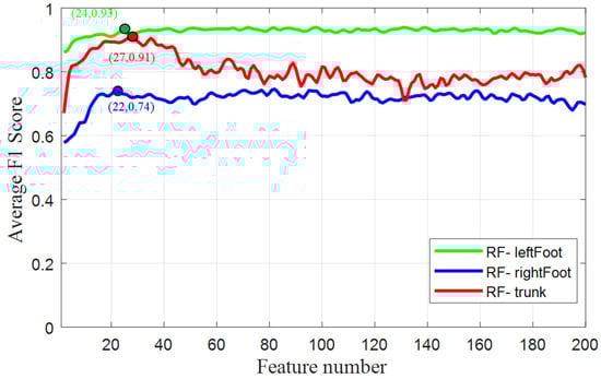 Using the average F1 score across all posture classes from each body part as a metric, the best combination of pressure features for each RF classifier was determined. Figure 6 shows that the classifier RF-trunk achieved the highest prediction accuracy (91%) when only 27 important features were used, and the accuracy was notably compromised when more than 40 features were involved. The prediction accuracy of RF-leftFoot plateaued (93%) at around 24 important features and remained stable thereafter. For classifier RF-rightFoot, the potential best accuracy (around 74%) was first approached when 22 important features were selected. Note that the use of more features did not necessarily improve posture recognition scores. The selected important features are given in Table S2 (Supplementary Materials).