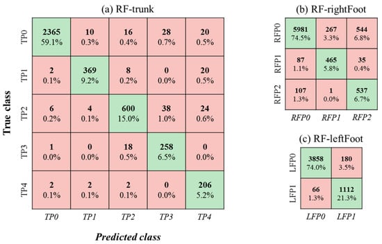 With the best combinations of pressure features extracted from the original pressure mats, the F1 scores from the 23-fold cross-validation of different classifiers are summarized in Table 2. The RF classifier outperformed the other four classifiers regardless of which body part or posture class was used. Using the three RF classifiers, F1 scores ranged from 85% to 98%, from 90% to 97%, and from 61% to 92% for the trunk, left-foot, and right-foot posture classes, respectively. An average F1 score of 86% across the 10 posture classes was obtained. The confusion matrices of the three RF classifiers are given in Figure 7. Among the three body parts, the main confusion was determined for the classification of right-foot postures. As shown in Figure 7b, RFP0 (right foot on accelerator pedal) was occasionally misclassified as RFP1 (right foot on brake pedal) or RFP2 (right foot on floor).