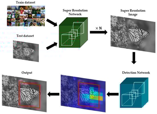Real-time object detection techniques have been applied to a variety of computer vision areas [1,2], such as object classification or object segmentation. Since it is mainly operated on the constrained environments, input images obtained from those environments can be deteriorated by camera noises or compression artifacts [3,4,5]. In particular, it is hard to detect objects from the images with low quality. Super resolution (SR) method aims at recovering a high-resolution (HR) image from a low-resolution (LR) image. It is primarily deployed on the various image enhancement areas, such as the preprocessing for object detection [6] of Figure 1, medical images [7,8], satellite images [9], and surveillance images [10]. In general, most SR methods can be categorized into single-image SR (SISR) [11] and multi-image SR (MISR). Deep neural network (DNN) based SR algorithms have been developed with various neural networks such as convolutional neural network (CNN), recurrent neural network (RNN), long short-term memory (LSTM), and generative adversarial network (GAN). Recently, convolutional neural network (CNN) [12] based SISR approaches can provide powerful visual enhancement in terms of peak signal-to-noise ratio (PSNR) [13] and structural similarity index measure (SSIM) [14].