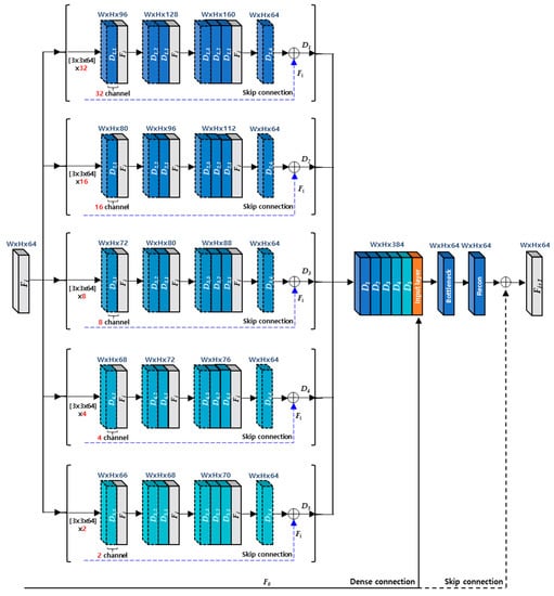 Figure 4 shows the detailed architecture about a MCDB. A MCDB has 5 dense blocks with the different channel size, and each dense block contains 4 dense layers. In order to describe the procedures of MCDB, we denote the -th dense layer of -th dense block as a in this paper. For the input feature maps (), -th dense block generates output feature maps as in Equation (4), which combine the feature maps () with a skip connection ().
