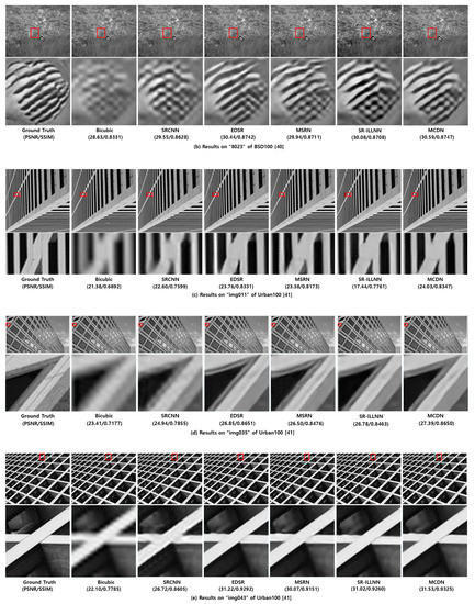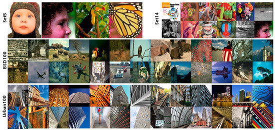 As shown in Figure 5, we used DIV2K dataset [37] at the training stage. It has 2K (1920 × 1080) spatial resolution and consists of 800 images. All training images with RGB are converted into YUV color format and extracted only Y components with the patch size of 100 × 100 without overlap. In order to obtain input LR images, the patches are further down-sampled to 25 × 25 by bicubic interpolation. In order to evaluate the proposed method, we used Set5 [38], Set14 [39], BSD100 [40], and Urban100 [41] of Figure 6 as the test datasets, which are commonly used in most SR studies [42,43,44]. In addition, Set5 was also used as a validation dataset.