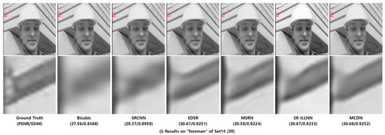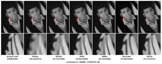 In terms of network complexity, we compared the proposed MCDN with SRCNN [18], EDSR [27], MSRN [30] and SR-ILLNN [31], respectively. Table 3 shows the number of network parameters and total memory size (MB). As shown in Table 3, MCDN reduces the number of parameters and the total memory size by as low as 1.2% and 17.4% compared to EDSR, respectively. Additionally MCDN marginally reduces the total memory size by as low as 92.2% and 80.5%, respectively, compared to MSRN and SR-ILLNN with lightweight network structures. Note that MCDN was able to reduce the number of parameters significantly because the parameters used in a MCDB are identically applied to other MCDBs.
